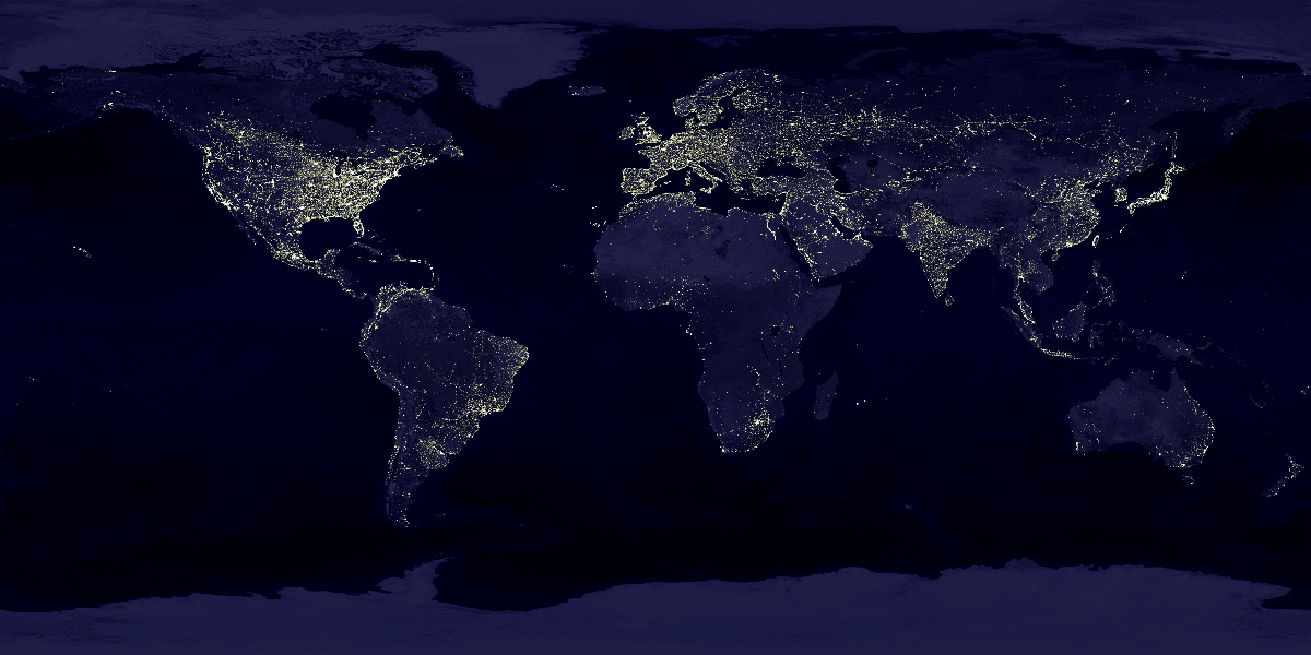 Regiões densamente povoadas, vistas como manchas contínuas