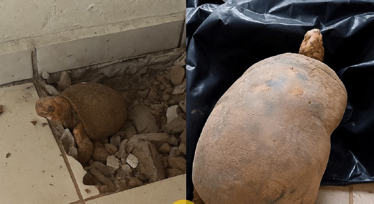 O jabuti caiu no local durante a obra, foi coberto sem que ninguém percebesse… e permaneceu preso lá desde então, completamente isolado no escuro total.