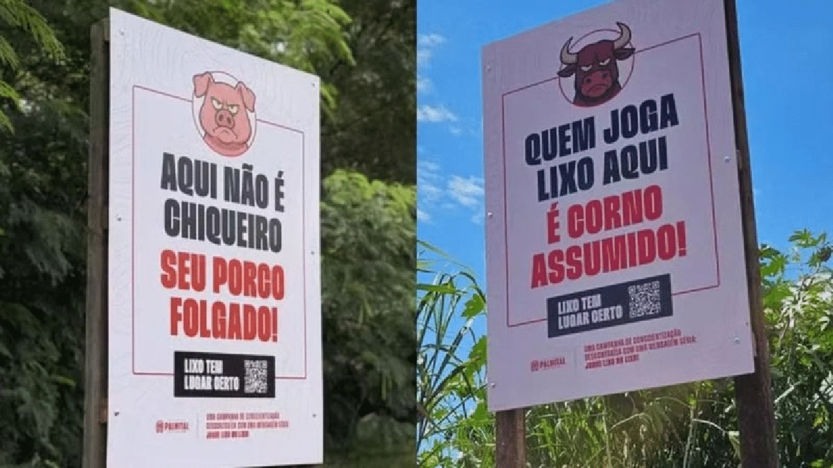 Placas instaladas em três locais com histórico de descarte clandestino trazem frases como “Quem joga lixo aqui é corno assumido” e “Aqui não é chiqueiro, seu porco folgado!”. A iniciativa da administração municipal mescla linguagem irreverente com orientações práticas, incluindo QR Codes que direcionam moradores a um site com informações sobre horários de coleta e os pontos de descarte correto de resíduos.